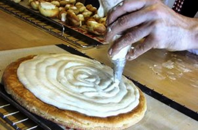 Après cuisson, couper le gâteau en deux moitiés dans le sens de l’épaisseur. Enlever le couvercle ainsi obtenu et garnir l’intérieur du gâteau avec de la crème à saint-honoré (voir les crèmes de base)