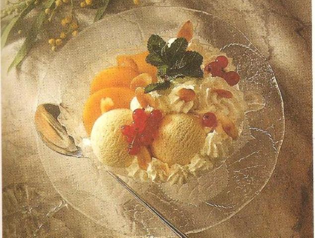 . Garnir la coup de glace à la vanille . disposer à Côte une demi- pêche pochée au sirop coupée en quartiers , puis entourer de crème chantilly.
