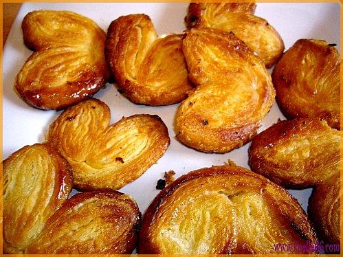 donner quatre nouveaux tours à des rognures de feuilletage ou à feuilletage à six tours ,en saupoudrant copieusement la pâte de sucre glace .étendre la pâte en une abaisse d'au moins 20cm de large sur 1mm d'épaisseur , et d'une longueur proportionnelle à la quantité de pâte employée.saupoudrer à nouveau de sucre glace . déterminer le centre sur la largeur ,sans séparer la pâte .replier chaque coté sur lui -meme en trois fois , puis replier à nouveau la bande obtenue en forme de portefeuille .diviser le tout en tronçons de 1cm d'époser les palmiers à plat sur une plaque , en les espaçant suffisamment pour qu'ils ne risquent pas de se toucher , la pâte s'étalant à la cuisson .